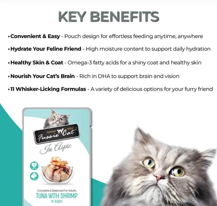 Introducing our newest line to the Fussie Cat family, Fussie Cat Premium Pouches! Our new line of gourmet cat food has a high moisture content to help support daily hydration needs. Being rich in DHA and Omega 3 Fatty Acids not only helps support healthy skin and shiny coat but helps support brain and vision development as well. Fussie Cat Premium Pouches are a Complete and Balanced diet for adult cats and are available in 11 whisker-licking formulas.