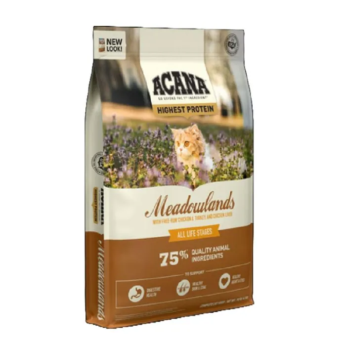 Our ACANAยฎ foods always goes beyond the 1st ingredient, thoughtfully crafting our recipes from start to finish. Inspired by the fertile soil of Kentucky, our grain-free ACANAยฎ Meadowlands is crafted with 75%* quality animal ingredients like fresh or raw** free-run chicken and turkey, freshwater fish, and cage-free eggs, and 35%+ fruits, vegetables, and probiotics with no added soy, corn, wheat or tapioca. Artificial colors, flavors or preservatives are never added in our kitchen. Our premium ingredients come from a curated group of farmers, ranchers and fishermen weโve known and trusted for decades, and we approach every batch with an unsurpassed commitment to safety and quality in our award-winning Kentucky kitchen. The result is a protein-rich, nutritious, and delicious cat food to help them live a healthy, happy life. *approximate and derived from the unprocessed state of the ingredients. +we also add vitamins, minerals, natural preservatives and probiotics **Our fresh ingredients use refrigeration as the sole method of preservation. Our raw ingredients are the same as our fresh, but are frozen at the peak of freshness to preserve nutrients