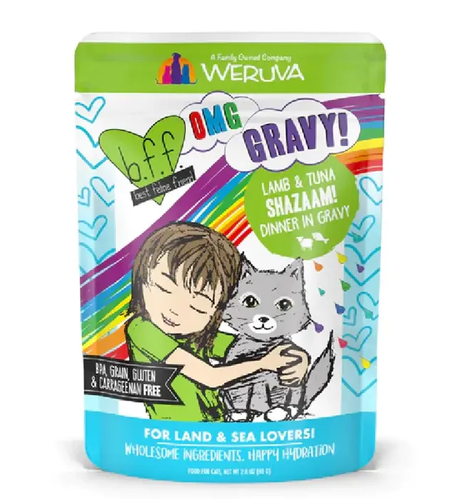 B.F.F. Oh My Gravy! - OMG!, from Best Feline Friends, is packed with hydration thanks to our unique recipes featuring an irresistible gravy base made from lamb broth.
