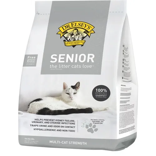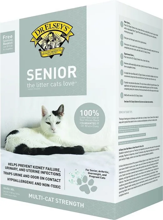Senior absorbs urine and odor on contact and traps it inside the crystals to keep a catโs genital area clean to help prevent kidney failure and urinary tract infections. The small particle size and dust fines also coat and dehydrate cat feces to reduce odor. Dr. Elseyโs senior is cleaner because it contains no organic material such as wheat, pine, corn, paper or cedar. This litter is an amorphous silica gel infused with hydrolyzed herbs to draw cats to the litter box. Each box contains a free litter box solutions booklet to help cat owners solve their litter box problems.