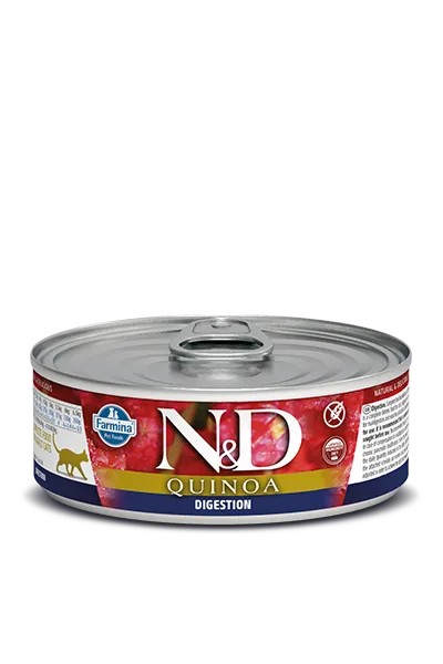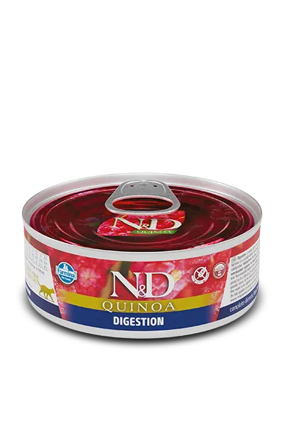 FUNCTIONAL WET FOOD. N&D rawcanโข Quinoa Digestion Lamb Feline is an all-natural complete wet food formulated to meet the nutritional levels for maintenance. A special functional L.I.D. wet formula recommended especially for cats with digestive issues and exocrine pancreatic insufficiency. Our rawcanโข technology is a proprietary 1-step gentle steam cooking process to ensure the bioavailability of the nutrients of each ingredient in every diet. Made with GMO-Free and human-grade fresh (never frozen) ingredients like boneless free-range grass-fed lamb, sustainablly sourced wild-caught herring, organic quinoa seed, artichoke and fennel. Low glycemic index, grain-free and gluten-free recipe with no legumes, potato, soy, by-products, hormones, antibiotics, or artificial preservatives. Made with natural antioxidants, prebiotics and integrated additional taurine. No Guar, Xanthan, Cassia, Industrial Gums, Carrageenan, or Emulsifiers used. No water or broth added for processing. All formulations are scientifically-proven and clinically-tested thru certified cruelty-free research. Fully recyclable BPA-Free cans with FSC paper labels.