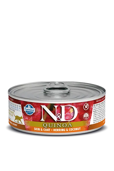 FUNCTIONAL WET FOOD. N&D rawcanโข Quinoa Skin & Coat Herring Feline is an all-natural complete wet food formulated to meet the nutritional levels for maintenance. A special functional L.I.D. wet formula recommended especially for cats with sensitivities. Speciffically designed to restore and maintain healthy skin and coat. Our rawcanโข technology is a proprietary 1-step gentle steam cooking process to ensure the bioavailability of the nutrients of each ingredient in every diet. Made with GMO-Free and human-grade fresh (never frozen) ingredients like sustainablly sourced wild-caught herring, organic quinoa seed and coconut. Low glycemic index, rich in zinc, high level omega 3 & 6 fatty acids, grain-free and gluten-free recipe with no legumes, potato, soy, by-products, hormones, antibiotics, or artificial preservatives. Made with natural antioxidants, prebiotics and integrated additional taurine. No Guar, Xanthan, Cassia, Industrial Gums, Carrageenan, or Emulsifiers used. No water or broth added for processing. All formulations are scientifically-proven and clinically-tested thru certified cruelty-free research. Fully recyclable BPA-Free cans with FSC paper labels.