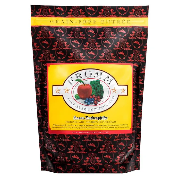Fromm Four-Star Hasen Duckenpfefferยฎ Recipe for cats is a rich, grain-free entrรฉe with rabbit, duck, peas, and potatoes. This recipe is specially prepared to ensure consistency, quality, and superior taste in each and every bowl. Hasen Duckenpfefferยฎ Recipe provides complete and balanced nutrition for cats of all ages and can be alternated with other Fromm Four-Star recipes.
