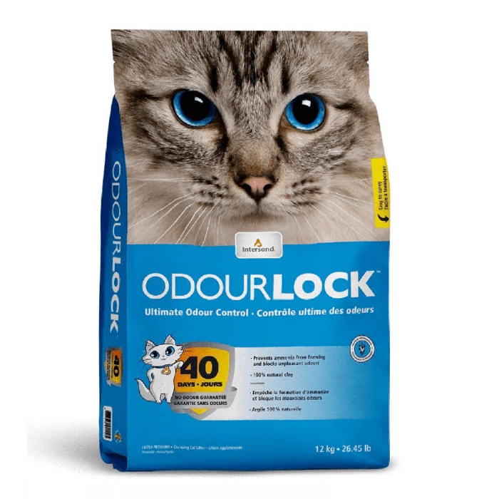 Intersand OdourLock clumping cat litter is made of all-natural clay. Its patented "Smart Odor Shield" technology blocks ammonia release, uniquely neutralizing urine and feces odors for 40 days. This ultra-fast clumping and easy-scooping litter makes litter box cleaning so effortless. OdourLock generates less waste than competing clay litters. Plus, it's 99.9% dust-free, leaving no tracking on floors or furniture and keeping your cat's and your family's respiratory systems safe. It is soft and comfortable for your cat. It is easily carried thanks to its side handle and is manufactured in Quebec, Canada.