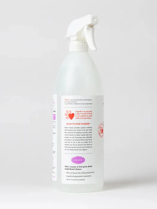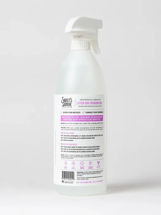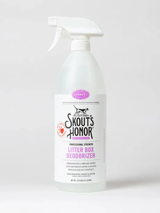 Keep your home smelling fresh with Skout's Honor Professional Strength Litter Box Deodorizer. This hard-working spray uses proprietary odor eliminating technology to instantly destroy odor molecules without any harsh chemicals. The eco-friendly composition is great for dog beds, litter boxes, skunk scents, feces, urine and any other offensive odors that pets leave behind. Made in the USA, this easy-to-use odor eliminator is a safe and non-toxic cleaning option to keep your home fresh, pleasant smelling and ready for the next stinky mess.
