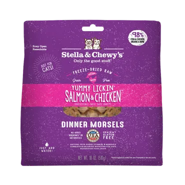 Salmon with Ground Bone Chicken with Ground Bone Chicken Liver Chicken Gizzard Pumpkin Seeds Potassium Chloride Sodium Phosphate Choline Chloride Fenugreek Seed Dried Pediococcus Acidilactici fermentation product Dried Lactobacillus Dried Bifidobacterium Longum fermentation product Dried Bacillus Coagulans fermentation product Taurine Mixed Tocopherols (preservative) Dandelion Dried Kelp Zinc Proteinate Iron Proteinate Vitamin A Supplement Vitamin E Supplement Niacin Supplement Copper Proteinate Riboflavin Supplement Sodium Selenite D-calcium Pantothenate Biotin Manganese Proteinate Thiamine Mononitrate Pyridoxine Hydrochloride Vitamin D3 Supplement Folic Acid Vitamin B12 Supplement