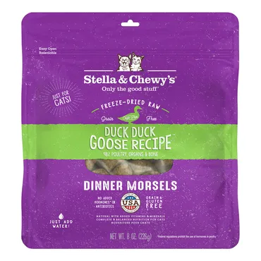 Stella and Chewys Freeze Dried Duck Duck Goose cat food is a delicious dinner that is 100% nutritionally balanced and complete for all life stages. Each nugget is freeze-dried to lock in nutrition and flavor. Duck duck goose dinner is made with raw, natural meat sourced from USDA-inspected facilities. Vitamins, minerals, probiotics and taurine are added to enhance your cat's health. With no added fillers, you can feel good about feeding this food to your best feline friends!!