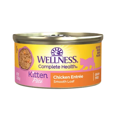 Nourish your growing kittyโs nose-to-tail well-being with the protein-rich nutrition of the Wellness Complete Health Kitten Formula Grain-Free Canned Cat Food. With chicken as the first ingredient, this nutrient-dense, grain-free recipe contains all the protein your pal needs to support his growing muscles and energy to fuel all his adventures. Every bite is packed with omegas from flaxseeds and fish oil to support a healthy skin and coat, plus antioxidants, taurine, vitamins and minerals for all those growth spurts! Serve up a bowl and feel good about providing your kitten with everything he needs to grow strong, and nothing you wouldnโt want him to eat, like fillers or anything artificial. Plus, the savory sauce will keep him coming back for more!