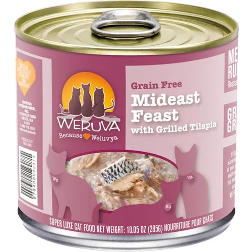 Your cat will feel like royalty with Weruva's Mideast Feast With Grilled Tilapia Canned Cat Food. The Tilapia is historically known as the ""fish of the Nile"" so your cat is going to be eating like the royal Pharaohs themselves. The Weruva Mideast Feast With Grilled Tilapia Canned Cat Food is free of GMOs, grains, carrageenan, and MSG giving your furry friend a balanced meal with every can. This wholesome food also contains a bunch of vitamins, omegas, and minerals helping your little carnivore's health as they grow into the royal beast they were destined to be.