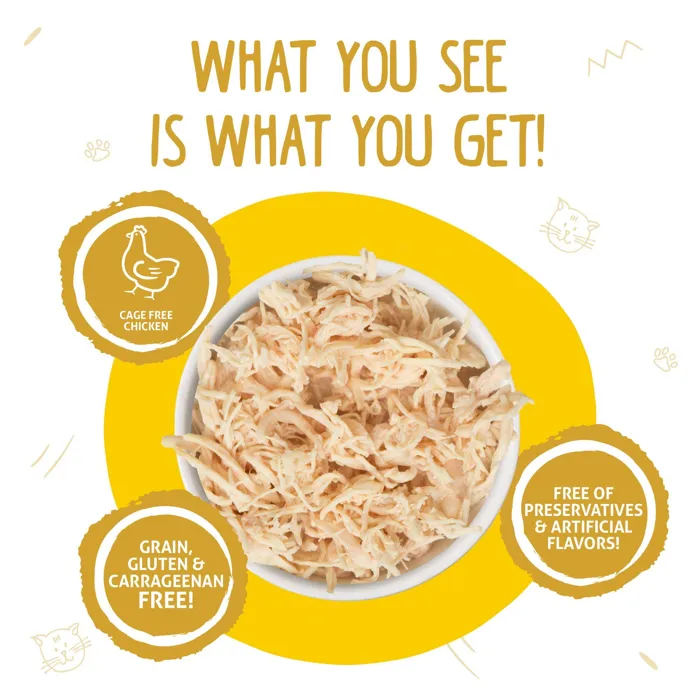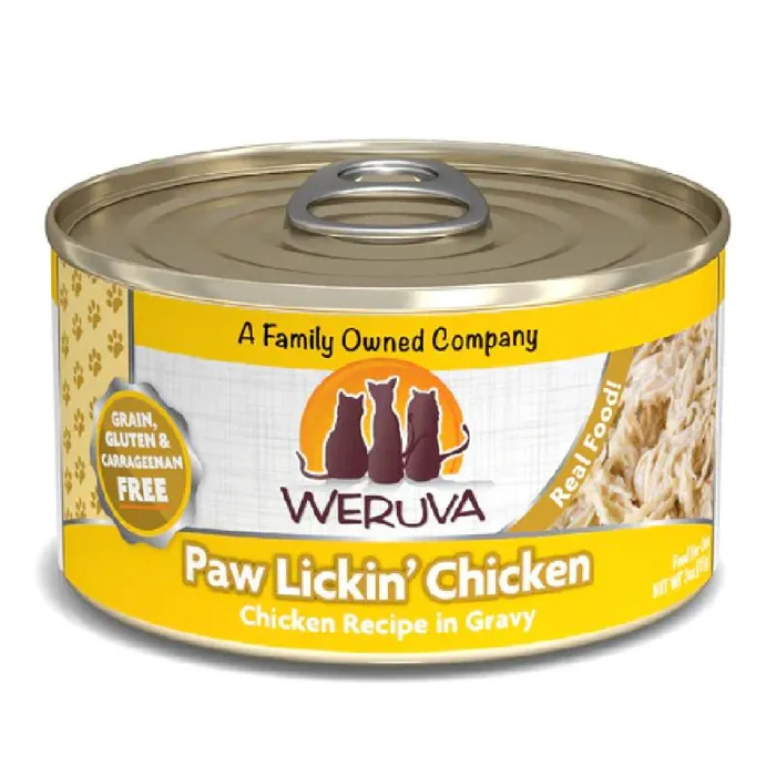 Simple, delicious, and paw lickin' good. No vegetables, grains, GMOs, MSG, and carrageenan, your little carnivore will be lickin it's paws once it gets a taste of the Weruva Paw Lickin' Chicken Canned Cat Food. Weruva's Paw Lickin' Chicken Canned Cat Food is full of whole, boneless, skinless, and cage-free chicken breast, free of hormones, and added antibiotics for a happy and healthy kitty. This simple meal is an easily identifiable food as the only protein provided is the delicious shredded chicken.