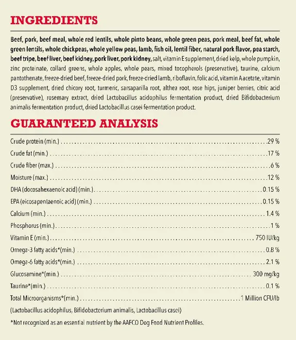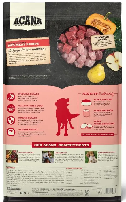Our ACANAยฎ foods always goes beyond the 1st ingredient, thoughtfully crafting our recipes from start to finish. ACANA Red Meat recipe is balanced with 60%* quality animal ingredients like ranch-raised beef and Yorkshire pork, and 40%+ fruits, vegetables, and botanicals. Artificial colors, flavors or preservatives are never added in our kitchen. Our premium ingredients come from a curated group of farmers, ranchers and fishers weโve known and trusted for decades, and we approach every batch with an unsurpassed commitment to safety and quality in our award-winning Kentucky kitchen. The result is a protein-rich, nutritious, and delicious dog food to help them live a healthy, happy life. *approximate and derived from the unprocessed state of the ingredients. +we also add vitamins, minerals, natural preservatives and probiotics.