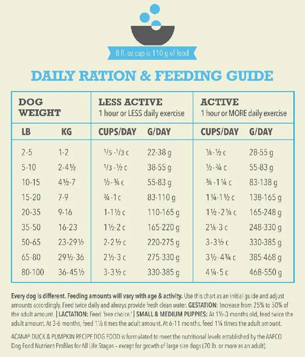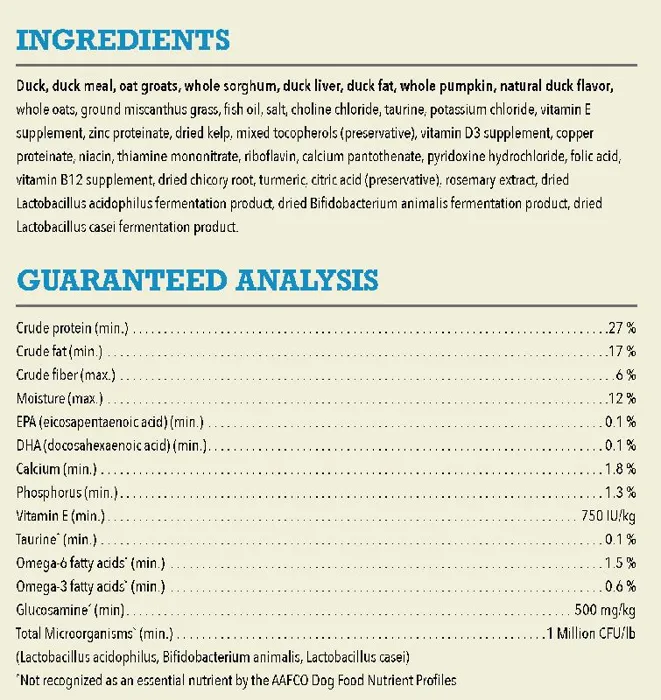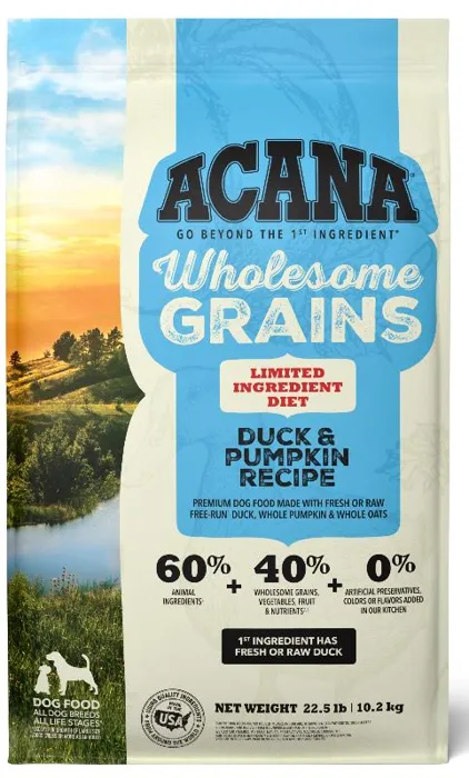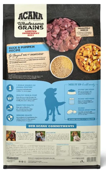 Our ACANAยฎ food for dogs always goes beyond the 1st ingredient, thoughtfully crafted from start to finish. ACANAยฎ Wholesome Grains Limited Ingredient Diet Duck & Pumpkin Recipe is packed with 60%* quality duck ingredients, and complemented with whole, delicious pumpkin and fiber-rich wholesome grains. It provides complete nutrition for choosy dogs or healthy dogs with food-sensitivities. Our premium ingredients come from a curated group of farmers, ranchers and fishers weโve known and trusted for decades, and we approach every batch with an unsurpassed commitment to safety and quality in our award-winning Kentucky kitchen. The result is a protein-rich, nutritious, and delicious dog food to help them stay happy and healthy. *approximate and derived from the unprocessed state of the ingredients.
