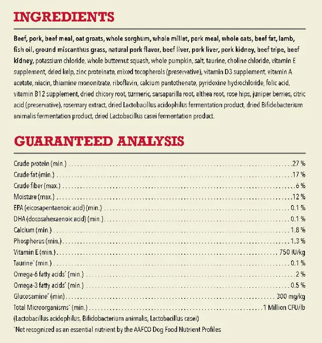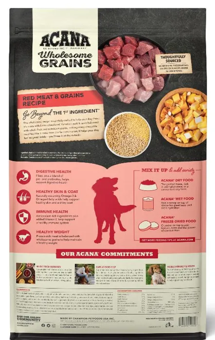 Our ACANAยฎ food for dogs always goes beyond the 1st ingredient, thoughtfully crafted from start to finish. ACANAยฎ Wholesome Grains Red Meat & Grains recipe is packed with our delicious ranch-raised beef, Yorkshire pork, and grass-fed lamb, and complemented with wholesome grains like oats, sorghum, and millet. These grains are high in fiber and gluten-free, offering added nutrition that helps support a healthy digestive environment. Our premium ingredients come from a curated group of farmers, ranchers and fishers weโve known and trusted for decades, and we approach every batch with an unsurpassed commitment to safety and quality in our award-winning Kentucky kitchen. The result is a protein-rich, nutritious, and delicious dog food to help them live a healthy, happy life.