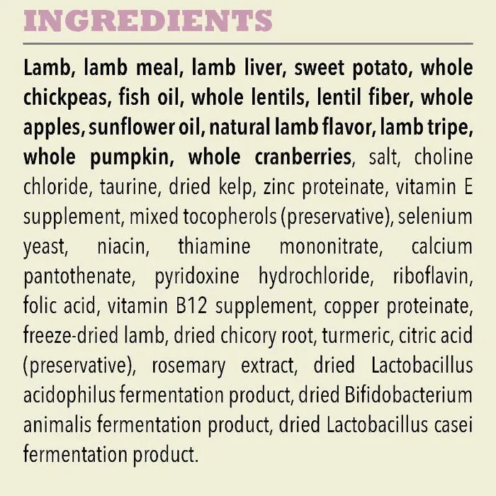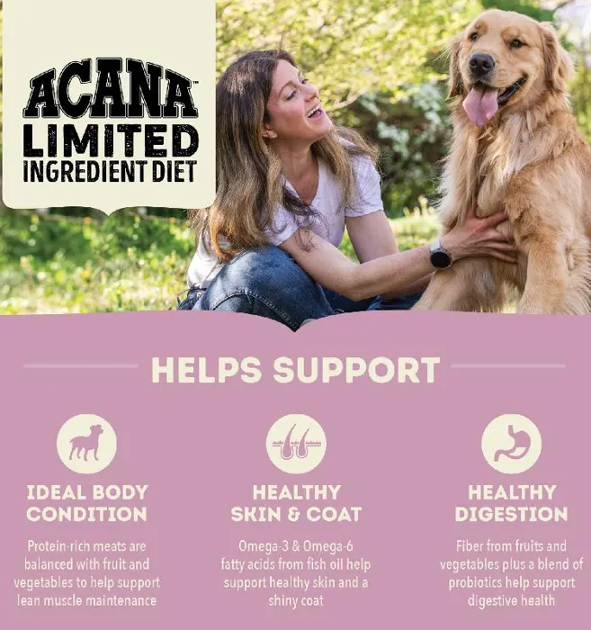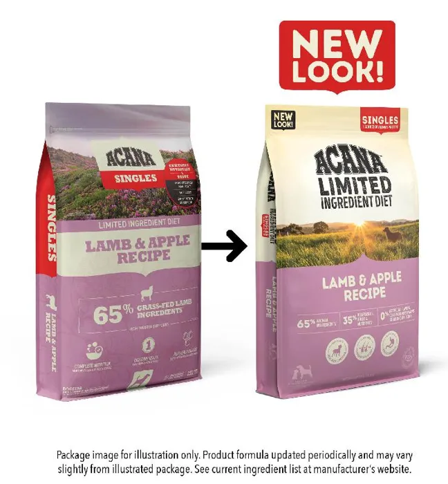 Our ACANAยฎ foods always goes beyond the 1st ingredient, thoughtfully crafting our recipes from start to finish. Our ACANA Singles Limited Ingredient Diet Lamb & Apple Recipe is now loaded with more lamb, fewer legumes and no peas for enhanced nutrition and taste your dog will love! Our enhanced recipe** includes 65%* quality ingredients from a single animal source and is complemented with whole, delicious apples. Complete nutrition for choosy dogs or healthy dogs with food sensitivities. Our premium ingredients come from a curated group of farmers, ranchers and fishers weโve known and trusted for decades, and we approach every batch with an unsurpassed commitment to safety and quality in our award-winning Kentucky kitchen. The result is a protein-rich, nutritious, and delicious dog food to help them stay happy, healthy, and thriving. *approximate and derived from the unprocessed state of the ingredients. **compared to our previous Lamb & Apple formula