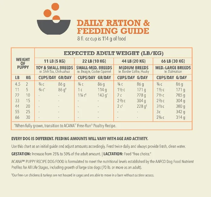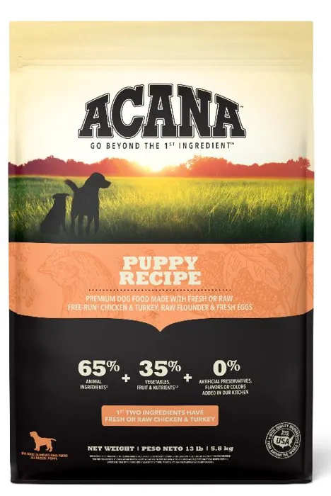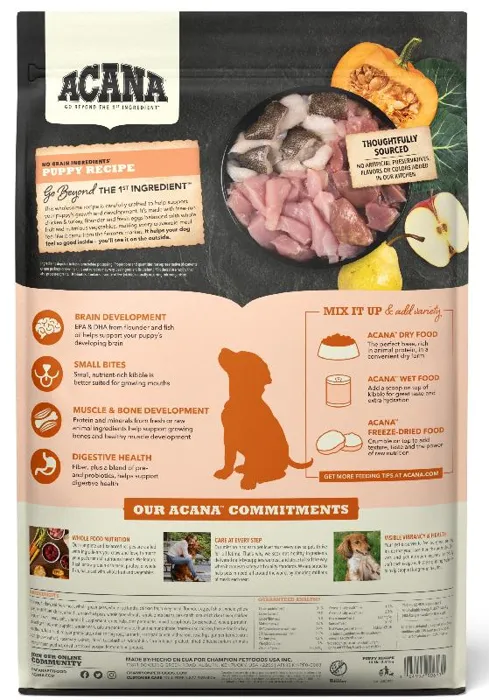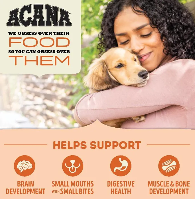 Our ACANAยฎ food for dogs always goes beyond the 1st ingredient, thoughtfully crafting our recipes from start to finish. Your growing puppy needs protein and fat from quality animal protein to support their development. ACANAยฎ Puppy & Junior is balanced with 60%* quality animal ingredients like free-run chicken and turkey, cage-free eggs, and 40%+ fruits, vegetables, and botanicals like whole pumpkin. Artificial colors, flavors or preservatives are never added in our kitchen. Our premium ingredients come from a curated group of farmers, ranchers and fishers weโve known and trusted for decades, and we approach every batch with an unsurpassed commitment to safety and quality in our award-winning Kentucky kitchen. The result is a protein-rich, nutritious, and delicious dog food to help them live a healthy, happy life. *approximate and derived from the unprocessed state of the ingredients. +we also add vitamins, minerals, natural preservatives and probiotics.