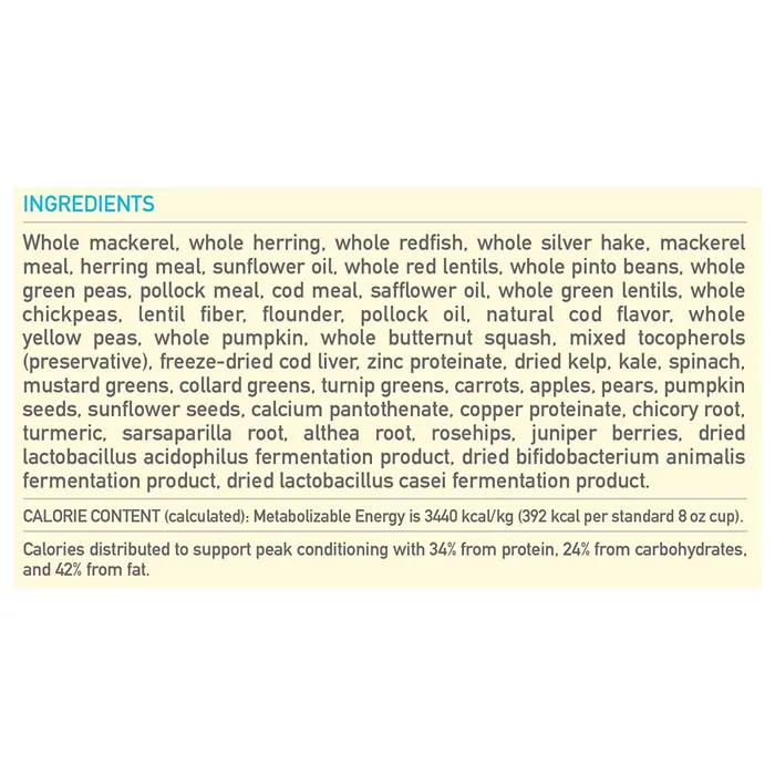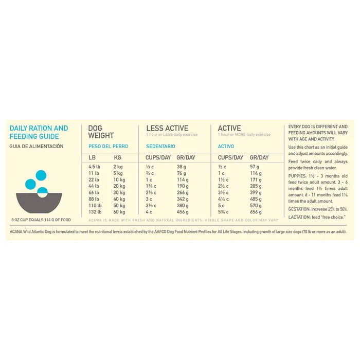 Our ACANAยฎ food for dogs always goes beyond the 1st ingredient, thoughtfully crafting our recipes from start to finish. With a recipe blend inspired by America's cold waters, ACANA Wild Atlantic is crafted with 70%* quality animal ingredients like whole mackerel, herring, redfish, silver hake, and flounder, and 30%+ fruits, vegetables, and botanicals, many delivered daily. Artificial colors, flavors or preservatives are never added in our kitchen. Our premium ingredients come from a curated group of farmers, ranchers and fishers weโve known and trusted for decades, and we approach every batch with an unsurpassed commitment to safety and quality in our award-winning Kentucky kitchen. The result is a protein-rich, nutritious, and delicious dog food to help them live a healthy, happy life. *approximate and derived from the unprocessed state of the ingredients. +we also add vitamins, minerals, natural preservatives and probiotics.
