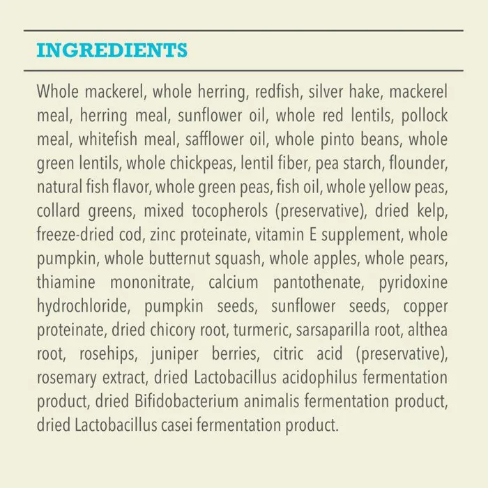 Our ACANAยฎ food for dogs always goes beyond the 1st ingredient, thoughtfully crafting our recipes from start to finish. With a recipe blend inspired by America's cold waters, ACANA Wild Atlantic is crafted with 70%* quality animal ingredients like whole mackerel, herring, redfish, silver hake, and flounder, and 30%+ fruits, vegetables, and botanicals, many delivered daily. Artificial colors, flavors or preservatives are never added in our kitchen. Our premium ingredients come from a curated group of farmers, ranchers and fishers weโve known and trusted for decades, and we approach every batch with an unsurpassed commitment to safety and quality in our award-winning Kentucky kitchen. The result is a protein-rich, nutritious, and delicious dog food to help them live a healthy, happy life. *approximate and derived from the unprocessed state of the ingredients. +we also add vitamins, minerals, natural preservatives and probiotics.