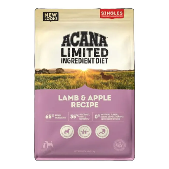 Our ACANAยฎ foods always goes beyond the 1st ingredient, thoughtfully crafting our recipes from start to finish. Our ACANA Singles Limited Ingredient Diet Lamb & Apple Recipe is now loaded with more lamb, fewer legumes and no peas for enhanced nutrition and taste your dog will love! Our enhanced recipe** includes 65%* quality ingredients from a single animal source and is complemented with whole, delicious apples. Complete nutrition for choosy dogs or healthy dogs with food sensitivities. Our premium ingredients come from a curated group of farmers, ranchers and fishers weโve known and trusted for decades, and we approach every batch with an unsurpassed commitment to safety and quality in our award-winning Kentucky kitchen. The result is a protein-rich, nutritious, and delicious dog food to help them stay happy, healthy, and thriving. *approximate and derived from the unprocessed state of the ingredients. **compared to our previous Lamb & Apple formula