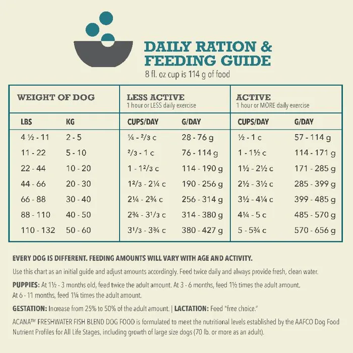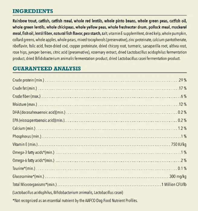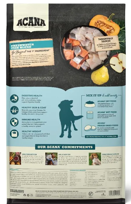 Our ACANAยฎ foods always goes beyond the 1st ingredient, thoughtfully crafting our recipes from start to finish. ACANA Freshwater Fish recipe is balanced with 60%* quality animal ingredients like rainbow trout, catfish, and perch, and 40%+ fruits, vegetables, and botanicals. Artificial colors, flavors or preservatives are never added in our kitchen. Our premium ingredients come from a curated group of farmers, ranchers and fishers weโve known and trusted for decades, and we approach every batch with an unsurpassed commitment to safety and quality in our award-winning Kentucky kitchen. The result is a protein-rich, nutritious, and delicious dog food to help them live a healthy, happy life. *approximate and derived from the unprocessed state of the ingredients. +we also add vitamins, minerals, natural preservatives and probiotics.