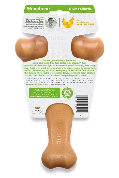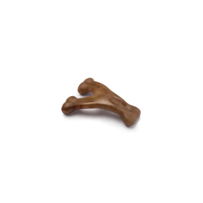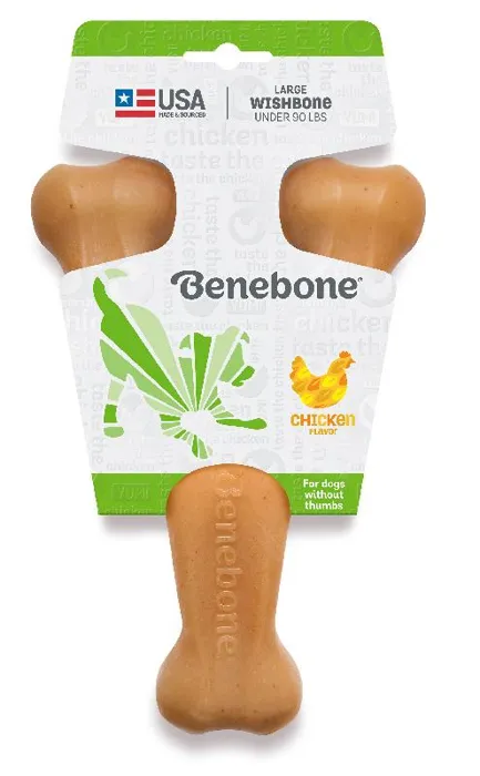 h3. Flavored Wishbone Dog Chew Toy, Made in USAAt Benebone, we started with the premise that dogs experience scent and flavor in a way we canโt even grasp. So, we ditched the neon colors and loud squeaks. Inspired by the dogโs powerful sense of smell, we developed a long-lasting durable chew thatโs jam-packed with real flavor. Once your dog takes a bite of our USA-made chews, heโll be hooked.* **Dog-Friendly Design** โ Last time we checked, dogs donโt have thumbs. Our wishbone chew is cleverly designed so your pup can get a good chew going.* **Real Flavor** โ We use only 100% real food ingredients for irresistible flavor and scent. We fuse 100% USA-sourced REAL BACON, REAL PEANUTS, or REAL CHICKEN all the way through the chew. Dogs can tell the difference.* **Made in the USA** โ We are fully committed to Made in USA, including packaging, tooling, and all material and ingredient sourcing. We proudly manufacture our products in New York.* **Dog Welfare** โ We are fully committed to the welfare of dogs through product donations and community involvement.* **Safety First** โ Benebones are not edible. Supervise closely and discard/replace when appropriate.**Instructions for Use and Safety Information:*** We use real flavors, including peanuts. Ensure nobody in the household is allergic to any of our tantalizing ingredients.* While recognizing that weight limit is a rough guide, our small products are for dogs under 30 lbs, our medium products are for dogs under 60 lbs, and our large products are for dogs under 90 lbs. Always choose the largest size your dog can handle.