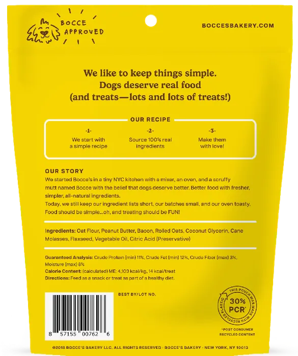 Bacon + Peanut Butter ... Need we say more? A softer cookie with limited ingredients and all-natural preservatives. Perfect for pups looking for a chewier bite.