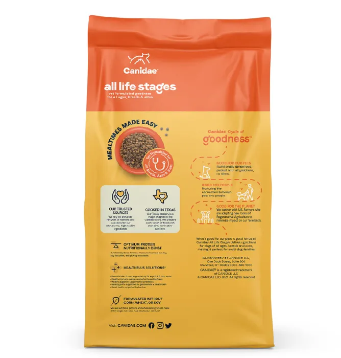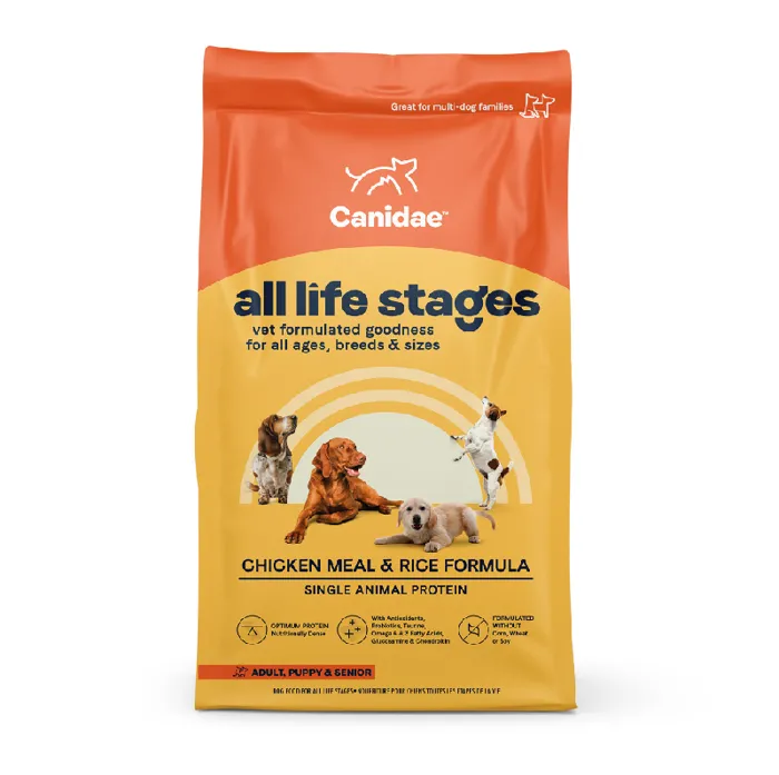 Whether you have one furry family member or five, Canidae All Life Stages Chicken Meal and Rice Formula Dry Dog Food is a paw-sitively perfect option for you! This canine kibble is vet-formulated for dogs of all ages, breeds and sizes, from puppies to seniors. Made with premium ingredients like real fruit, vegetables and protein from real chicken, this formula is 100% free of corn, wheat or soy and is designed to provide your pal with the wholesome nutrition she needs. This CANIDAE one-recipe-serves-all approach makes mealtime easy and cost-effective for both multi-dog households and even single-dog households - no more guessing or switching food based on your pets' age, breed or size!