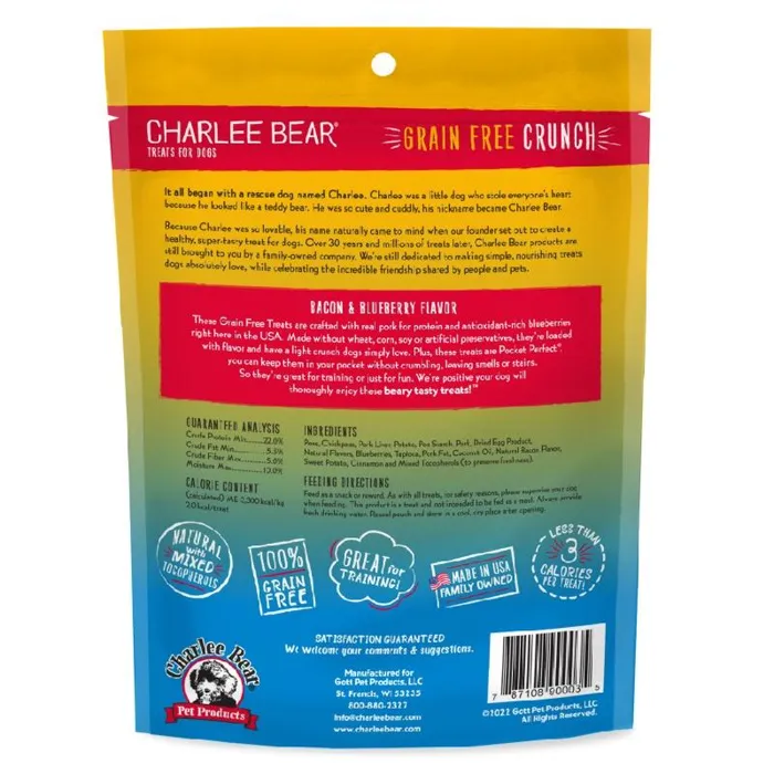 Give your dog the flavor-packed, natural taste of home with Charlee Bear Natural Bear Crunch Bacon & Blueberry Grain-Free Dog Treats. They're made with real, wholesome ingredients, just like mom's homemade biscuits! Great for small dogs, large dogs and all dogs in between, you can use them to treat your dog anytimeโwhether you're congratulating them for great behavior or just saying, "I love you!" Plus, they're perfect for training because they're stain, smell, and grease freeโwhich makes them pocket perfect, so you can be ready to reward anytime.