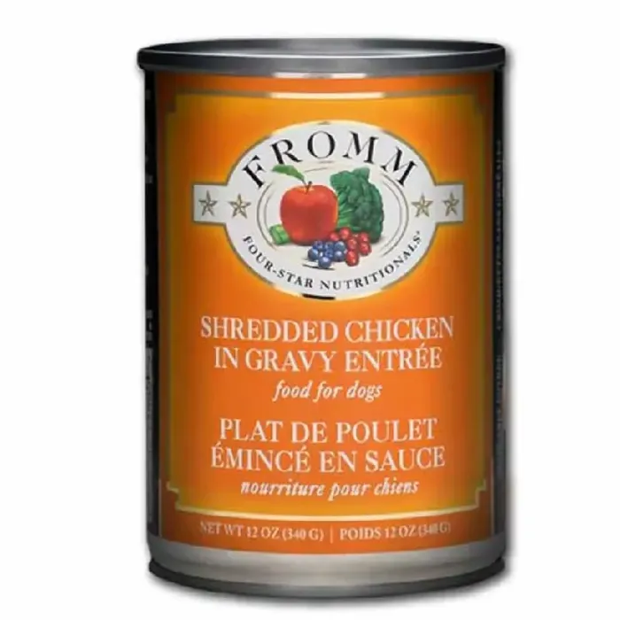 Perfect as a complete meal or accompanying your dog's favorite dry food, Fromm Four Star Shredded Grain Free Chicken in Gravy Canned Dog Food provides balanced and complete nutrition for all breeds and all stages of life. This recipe is made with high quality shredded chicken paired with potatoes, carrots, and beans cooked together in a chicken broth. Fromm Four Star Shredded Grain Free Chicken in Gravy Canned Dog Food is grain free and made with no artificial colors, flavors, or preservatives.