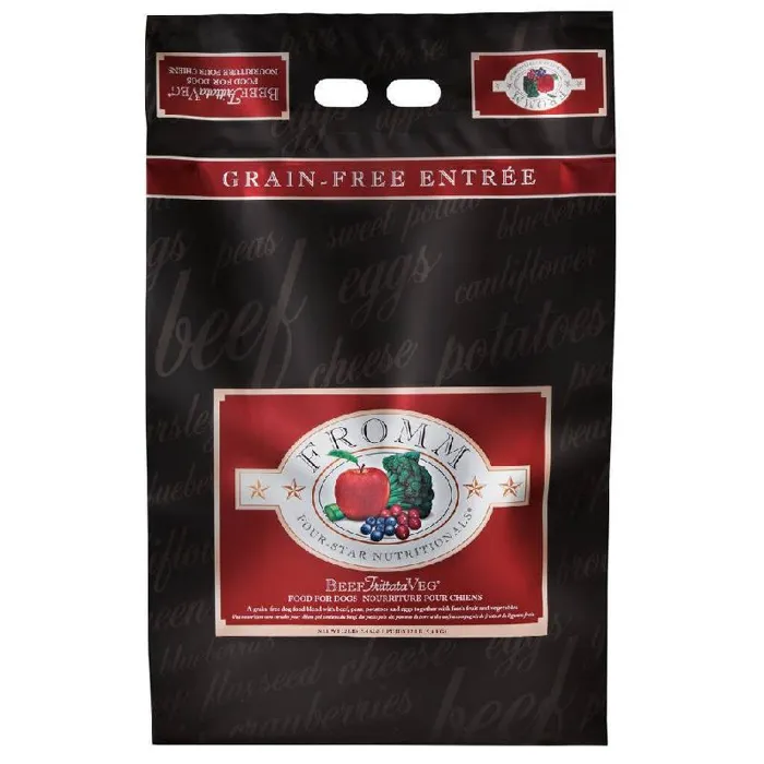 Keeping the needs of your dog in mind, Fromm Four Star Grain Free Beef Frittata Veg Dry Dog Food is made to support the all breeds in all stages of life. Made with high amounts of protein and paired with fresh produce including potatoes and carrots to provide high quality, easily digestible carbohydrates. Fromm Four Star Grain Free Beef Frittata Veg Dry Dog Food provides well rounded, balanced nutrition for your furry friend without the unnecessary fillers! This recipe also supports the health of your dog's coat and skin with guaranteed levels of Omega fatty acids and is enhanced with probiotics to ensure that their digestion is right on track! Fromm Four Star Grain Free Beef Frittata Veg Dry Dog Food is grain free and made with quality ingredients found in the United States with no artificial colors, flavors, or preservatives that any pup is sure to love!