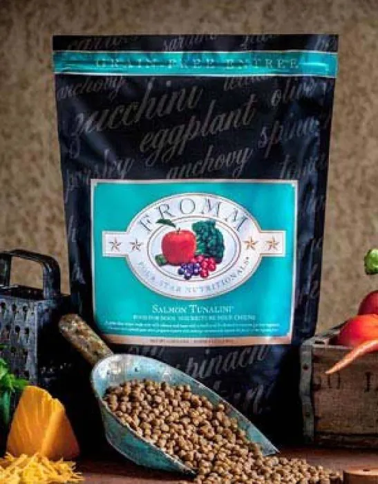 Keeping the needs of your dog in mind, Fromm Four Star Grain Free Salmon Tunalini Dry Dog Food is made to support the all breeds in all stages of life. Made with high amounts of protein and paired with fresh produce including potatoes and peas to provide high quality, easily digestible carbohydrates. Fromm Four Star Grain Free Salmon Tunalini Dry Dog Food provides well rounded, balanced nutrition for your furry friend without the unnecessary fillers! This recipe also supports the health of your dog‰ۡó»s coat and skin with guaranteed levels of Omega fatty acids and is enhanced with probiotics to ensure that their digestion is right on track! Fromm Four Star Grain Free Salmon Tunalini Dry Dog Food is grain free and made with quality ingredients found in the United States with no artificial colors, flavors, or preservatives that any pup is sure to love!