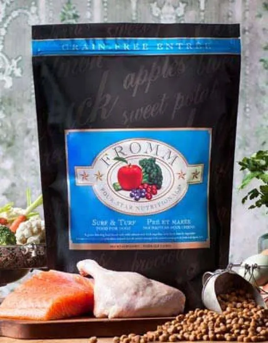 Keeping the needs of your dog in mind, Fromm Four Star Surf and Turf Dry Dog Foodฬค is made to support the all breeds in all stages of life. Made with high amounts of protein and paired with fresh produce including sweet potatoes and carrots to provide high quality, easily digestible carbohydrates. Fromm Four Star Grain Free Surf and Turf Dry Dog Food provides well rounded, balanced nutrition for your furry friend without the unnecessary fillers! This recipe also supports the health of your dog's coat and skin with guaranteed levels of Omega fatty acids and is enhanced with probiotics to ensure that their digestion is right on track! Fromm Four Star Grain Free Surf and Turf Dry Dog Food is grain free and made with quality ingredients found in the United States with no artificial colors, flavors, or preservatives that any pup is sure to love!