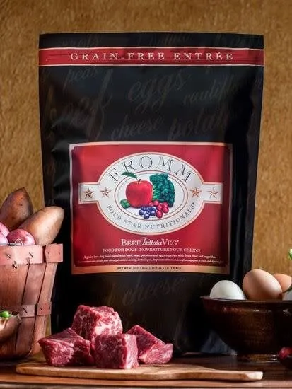 Keeping the needs of your dog in mind, Fromm Four Star Grain Free Beef Frittata Veg Dry Dog Food is made to support the all breeds in all stages of life. Made with high amounts of protein and paired with fresh produce including potatoes and carrots to provide high quality, easily digestible carbohydrates. Fromm Four Star Grain Free Beef Frittata Veg Dry Dog Food provides well rounded, balanced nutrition for your furry friend without the unnecessary fillers! This recipe also supports the health of your dog's coat and skin with guaranteed levels of Omega fatty acids and is enhanced with probiotics to ensure that their digestion is right on track! Fromm Four Star Grain Free Beef Frittata Veg Dry Dog Food is grain free and made with quality ingredients found in the United States with no artificial colors, flavors, or preservatives that any pup is sure to love!