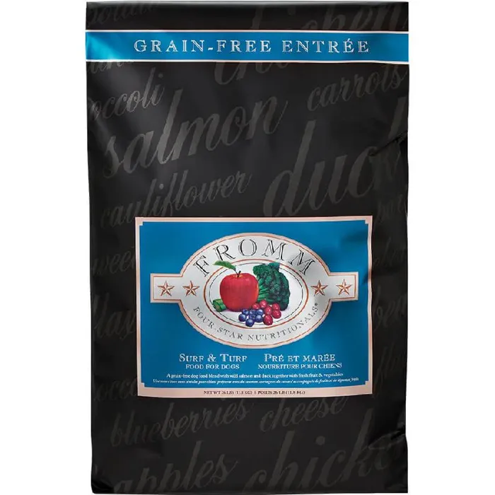 Keeping the needs of your dog in mind, Fromm Four Star Surf and Turf Dry Dog Foodฬค is made to support the all breeds in all stages of life. Made with high amounts of protein and paired with fresh produce including sweet potatoes and carrots to provide high quality, easily digestible carbohydrates. Fromm Four Star Grain Free Surf and Turf Dry Dog Food provides well rounded, balanced nutrition for your furry friend without the unnecessary fillers! This recipe also supports the health of your dog's coat and skin with guaranteed levels of Omega fatty acids and is enhanced with probiotics to ensure that their digestion is right on track! Fromm Four Star Grain Free Surf and Turf Dry Dog Food is grain free and made with quality ingredients found in the United States with no artificial colors, flavors, or preservatives that any pup is sure to love!