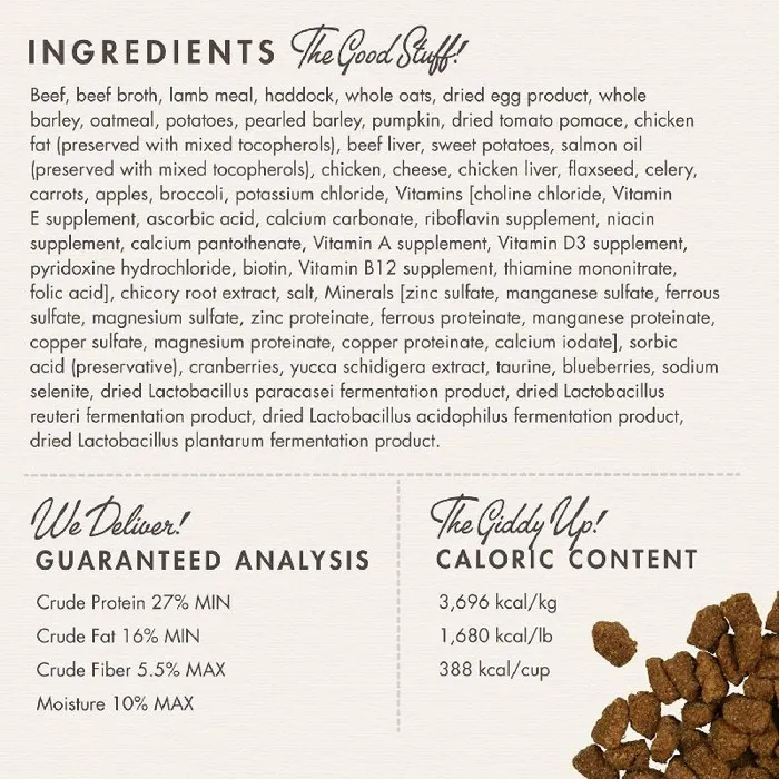 - High quality ingredients including beef, lamb, and barley