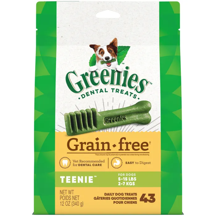 Made with a chewy texture to help fight plaque and tartar, Greenies Teenie Grain Free Dental Dog Chews are the perfect daily treat to help keep your pups teeth clean! These dental treats are all natural and grain free with easy to digest ingredients including potatoes and chickpeas!