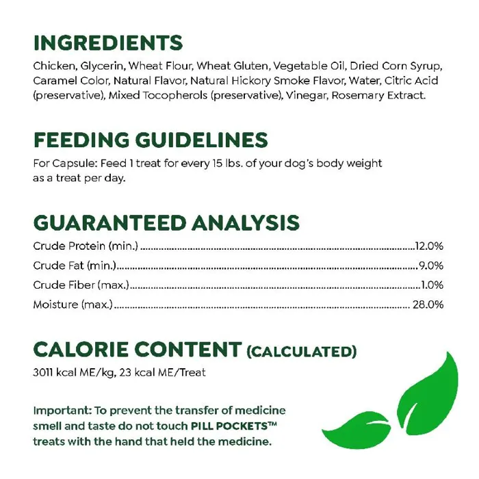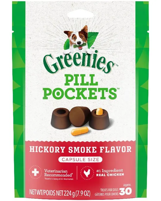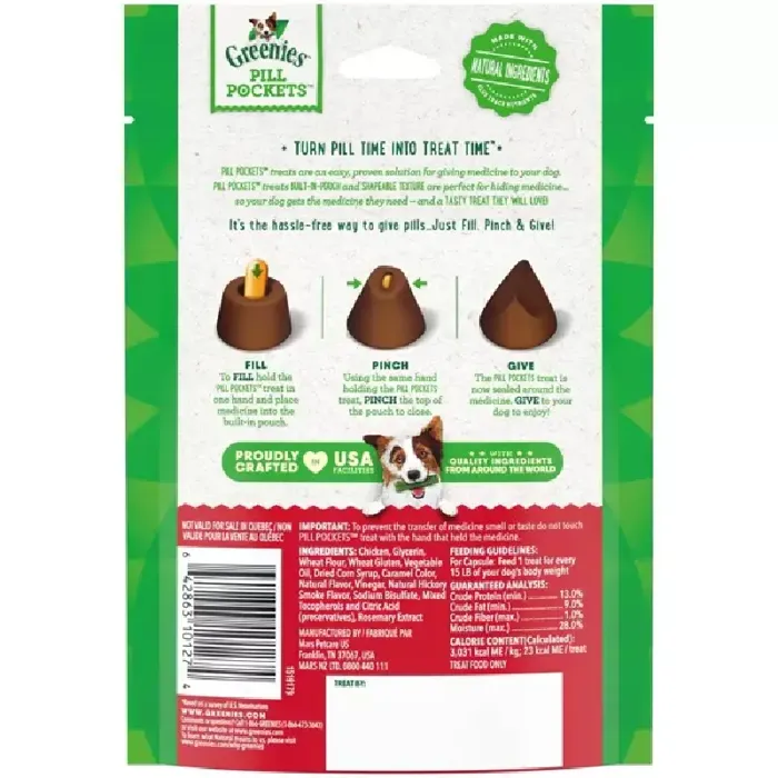 PILL POCKETS TURN PILL TIME INTO TREAT TIME. GREENIES Pill Pockets Treats for Dogs make it easy to give your dog medicine, with a tasty hickory smoke flavor theyโre sure to love. Why hide your petโs medicine in human foods like peanut butter or cheese when you can give them a healthy all natural dog treat, made with natural, real ingredients plus trace nutrients instead? Designed by veterinarians, GREENIES Pill Pockets Dog Treats mask the smell and taste of any medicine, taking the stress (and mess) out of giving your canine companion medicine. Whether for large breed or small dogs, these smaller-sized Pill Pockets for tablets make taking medicine a positive experience for your dog. And theyโre easy to give: Simply drop a tablet into the Pill Pockets pouch, pinch the top half closed, give it to your pup, and poof: Watch their medicine disappear. GREENIES Pill Pockets are the ingenious way to give your dog their medsโand theyโll never know the difference.