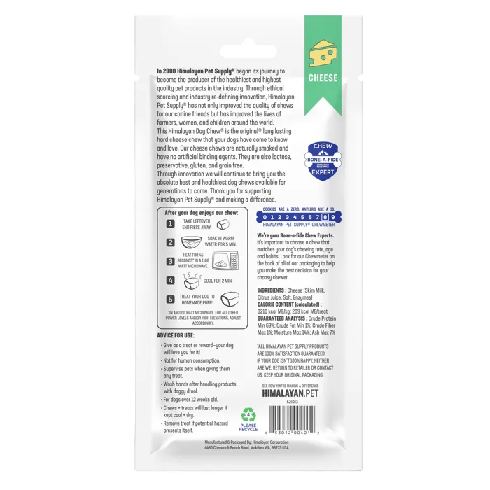 Himalayan Dog Chew is 100% natural with no preservatives. It is an authentic type of cheese eaten by the people of the Himalayas. When you give this chew to your dog, you know that you are providing them with hours of high quality eating entertainment.