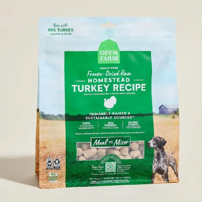Easy to serve and hard to resist. This high protein topper or complete meal is packed with humanely raised antibiotic-free raw turkey. For added nutritionรฅรOpen Farm includes functional ingredients like locally sourced leafy greens, squash and pumpkin seeds, superfoods like coconut oil, and antioxidants like blueberries.