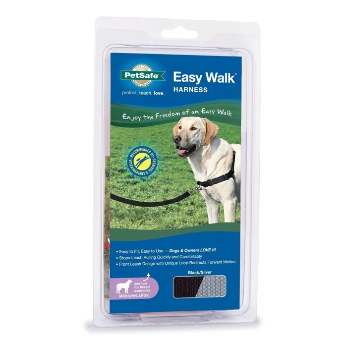 Some pups just donโt understand whoโs in charge of walks, so they drag and pull their people behind them. The PetSafeยฎ Easy Walkยฎ Harness was created by a veterinary behaviorist over 15 years ago to stop light to moderate pulling. It puts pet-parents in control of the leash and is recommended by vets and trainers. The patented front clip d-ring with martingale loop reduces leash pulling by steering your dog and provides more control of your walks. The quick-snap shoulder and belly straps allow you to fit the harness in just a few minutes. Our perfect-fit guarantee ensures it will fit pooches of all proportions. And, if your furry friend decides to turn the harness into a chew toy, we have a 1-year chew damage replacement policy for a minimal fee.