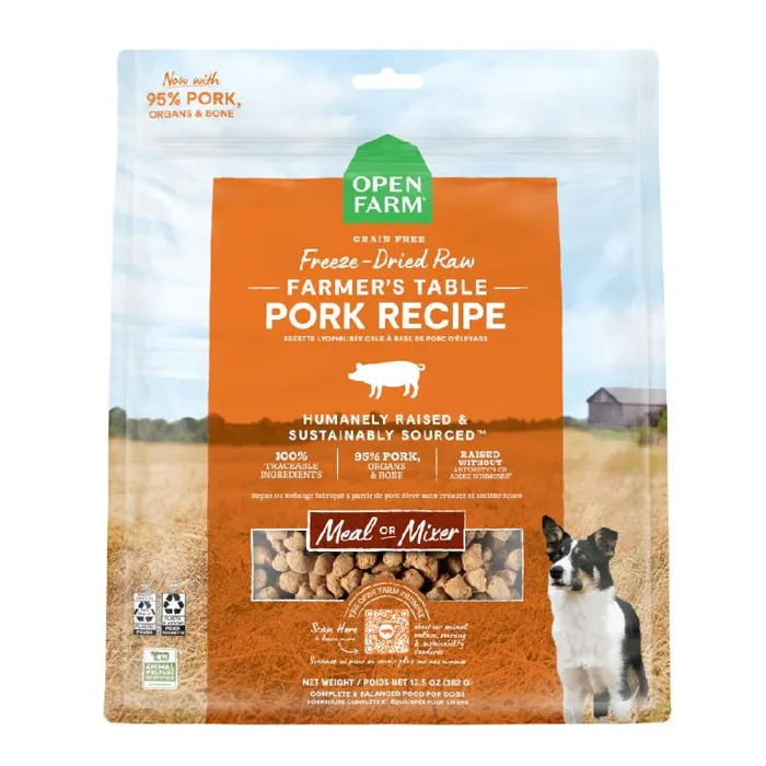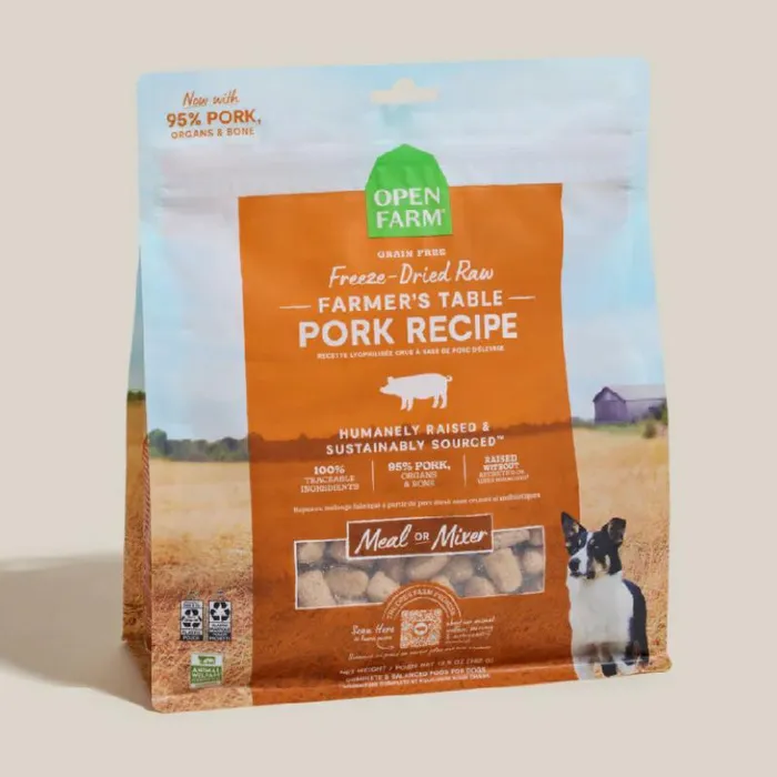 Easy to serve and easy to please. This high protein topper or complete meal is packed with humanely raised antibiotic-free raw pork. For addedรฅรOpen Farm includes functional ingredients like locally sourced leafy greens, squash and pumpkin seeds, superfoods like coconut oil, and antioxidants like blueberries.