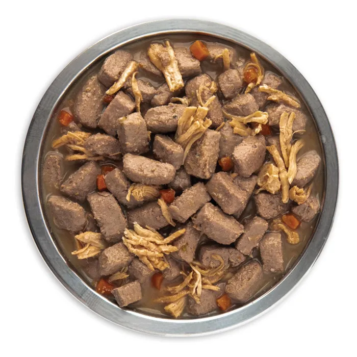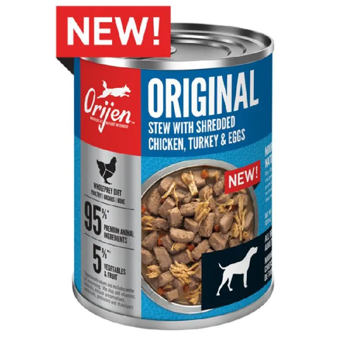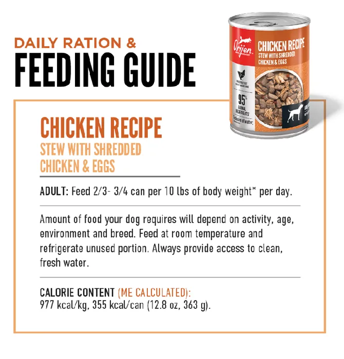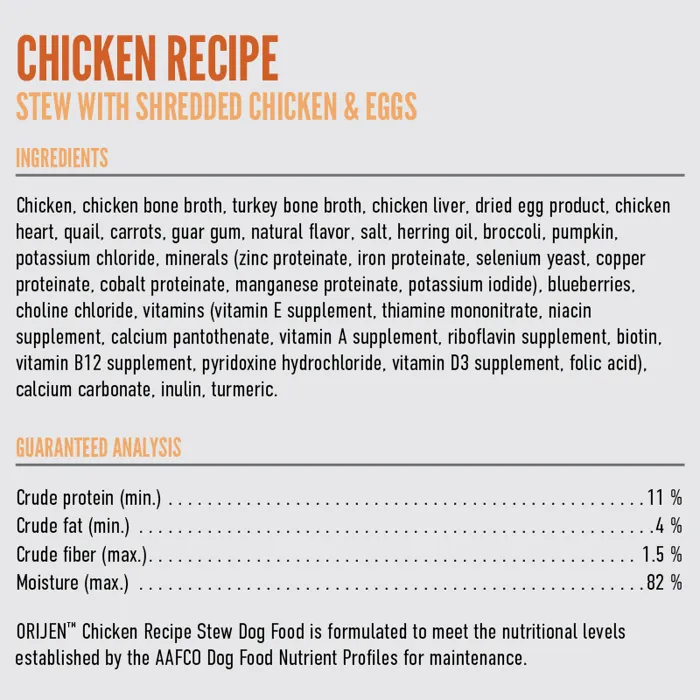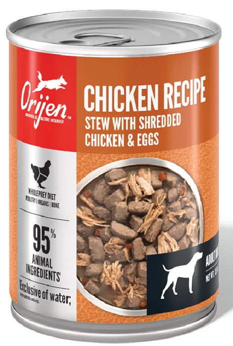 ORIJEN Chicken Recipe Stew is a nourishing wet food with rich inclusions of savory chicken shreds that will help your dog thrive. Packed with 95%* premium animal ingredients, ORIJEN Chicken Recipe Stew includes fresh or raw chicken ingredients. This includes succulent WholePrey ingredients like organs and bone, a source of essential vitamins, minerals and amino acids. Feed your dog ORIJEN Premium Wet Dog Food alone to add moisture and nourishment to their diet, or on top of their favorite ORIJEN kibble for a nutritious addition at mealtime.
