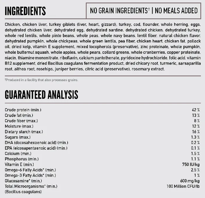 - Offers a rich diversity of fresh and raw meats; 85% meat inclusions, 15% veggies & fruits, and 0% grain, tapioca, or plant protein concentrates