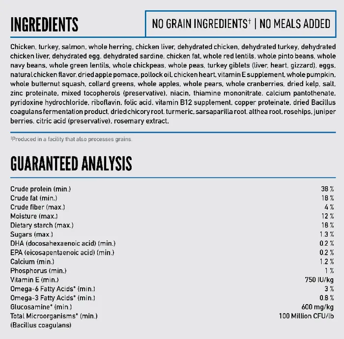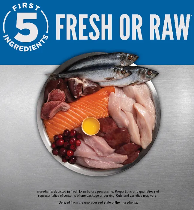 - Offers a rich diversity of fresh and raw meats; 85% meat inclusions, 15% veggies & fruits, and 0% grain, tapioca, or plant protein concentrates