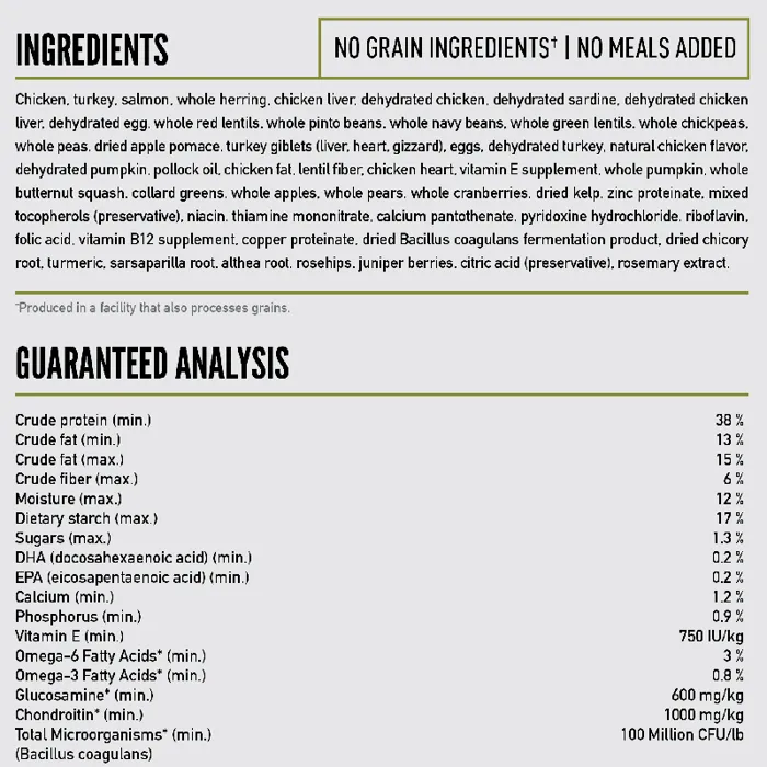 - Offers a rich diversity of fresh and raw meats; 85% meat inclusions, 15% veggies & fruits, and 0% grain, tapioca, or plant protein concentrates