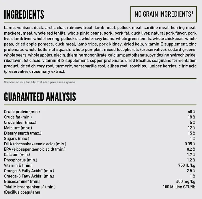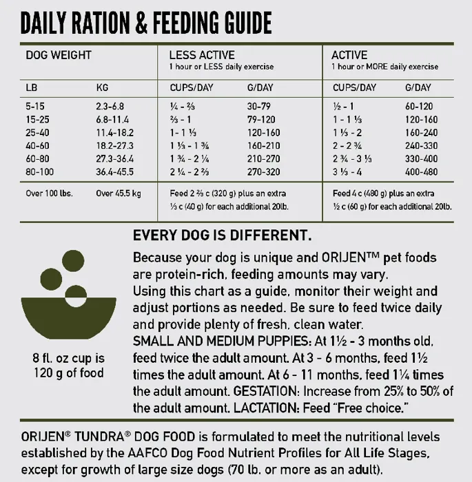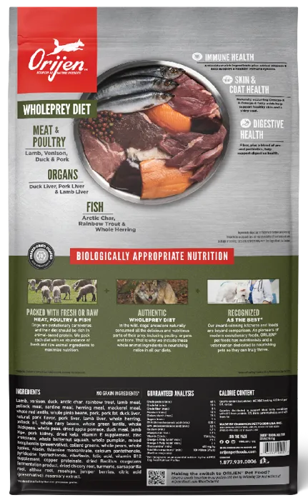 Dogs are ancestral carnivores, so their Biologically Appropriate diet is rich and varied in whole animal ingredients. ORIJEN Tundra recipe provides your dog with the nourishing protein and nutrients they need from grass-fed lamb, ranch-raised venison, duck & fish. With rich inclusions of WholePrey animals, ORIJEN dog food is made with the most nutrient-dense, succulent parts of the prey to deliver the nutrition dogs need.