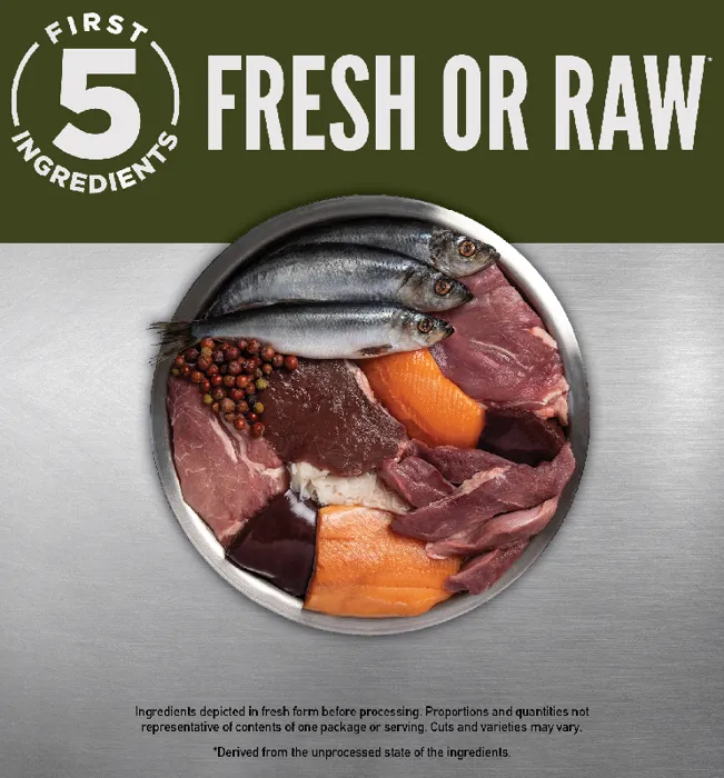 - First 5 ingredients always fresh or raw protein including meat and fish.