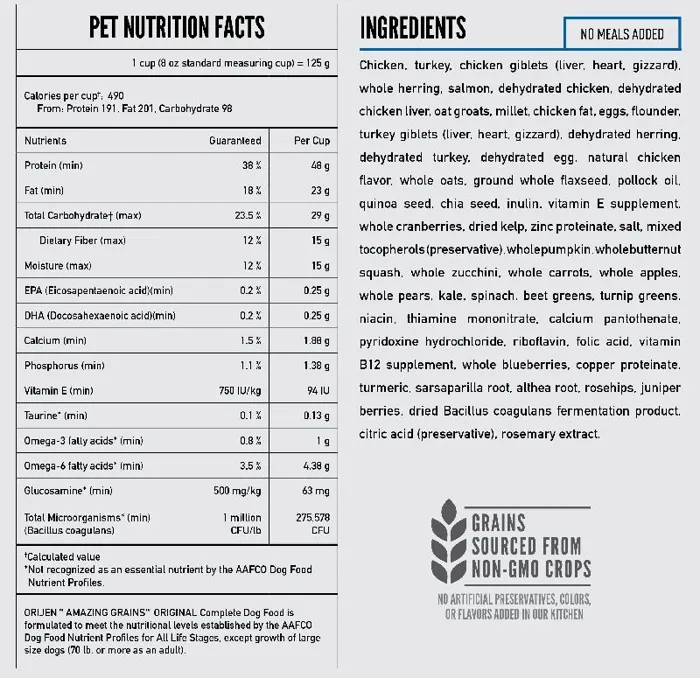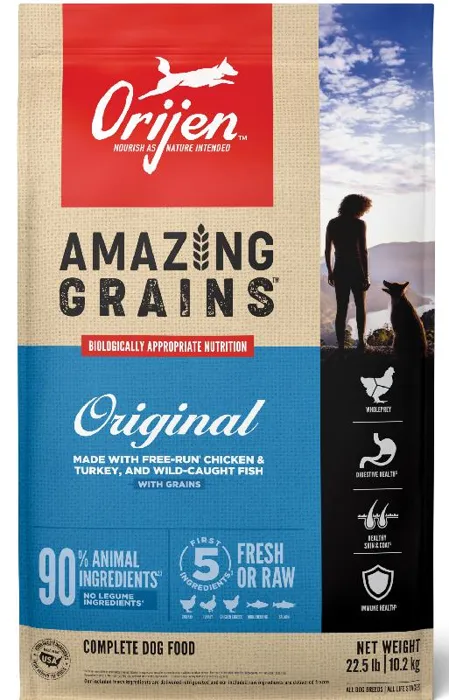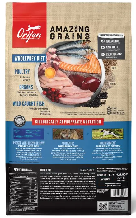 ORIJEN Amazing Grains is packed with fresh or raw animal protein and enhanced with hand-selected grains to give your dog peak nourishment. With 90%* premium animal ingredients, ORIJEN Original with Amazing Grains includes WholePrey ingredients from free-run chicken and turkey, and wild-caught fish. These nutrient-dense animal ingredients provide your dog with the protein, vitamins and minerals they need to thrive. This recipe also contains only the most amazing grains in a high-quality blend of oats, quinoa, chia and more, hand-selected to provide a balanced fiber ratio that helps support your dogโs digestive health.