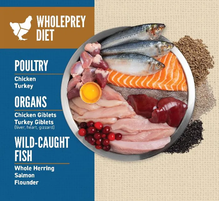 - Authentic WholePrey diet features the most succulent parts of the prey like poultry or fish, organs and bone to mimic what your dogโs ancestors consumed in the wild.