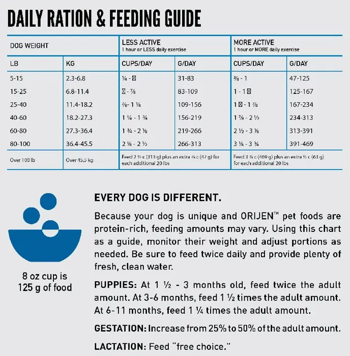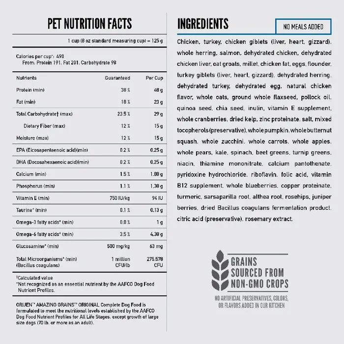 ORIJEN Amazing Grains is packed with fresh or raw animal protein and enhanced with hand-selected grains to give your dog peak nourishment. With 90%* premium animal ingredients, ORIJEN Original with Amazing Grains includes WholePrey ingredients from free-run chicken and turkey, and wild-caught fish. These nutrient-dense animal ingredients provide your dog with the protein, vitamins and minerals they need to thrive. This diet includes only the most amazing grains in a high-quality blend of oats, quinoa and chia and more, hand-selected to provide a balanced fiber ratio that helps support your dogโs digestive health.