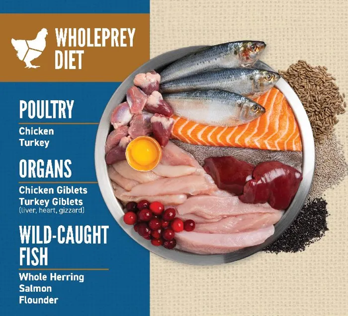 - Authentic WholePrey diet features the most succulent parts of the prey like poultry or fish, organs and bone to mimic what your dogโs ancestors consumed in the wild.
